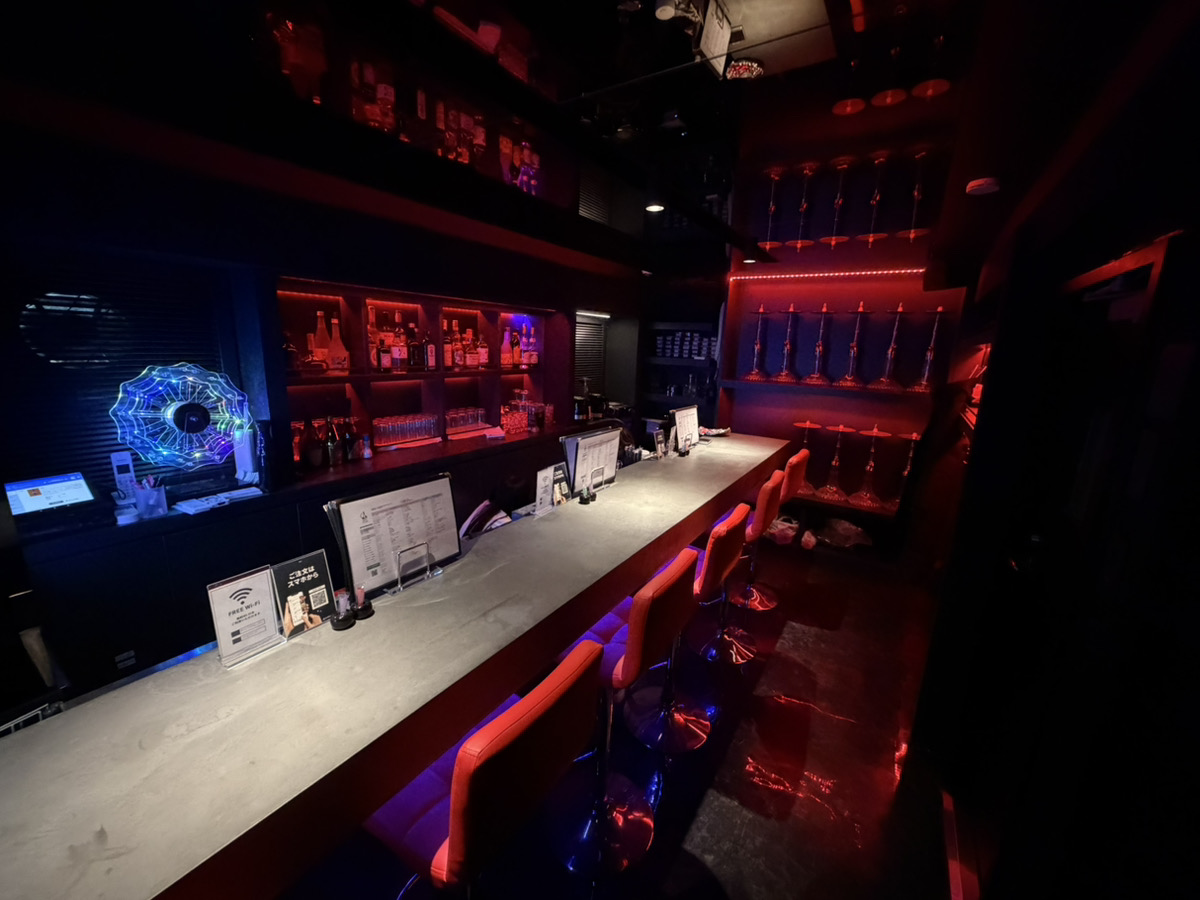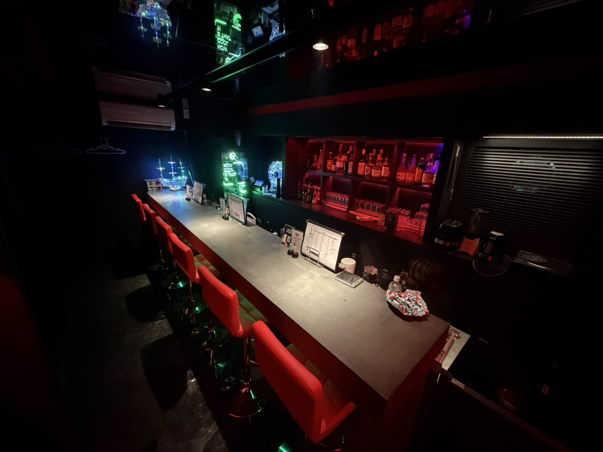 気分盛り上がりなムーディーな空間。赤を基調としたバーカウンター。まったりするもよし、スタッフと会話するもよし、一人で作業しながらでも非日常な空間を楽しんで頂ければと思います。